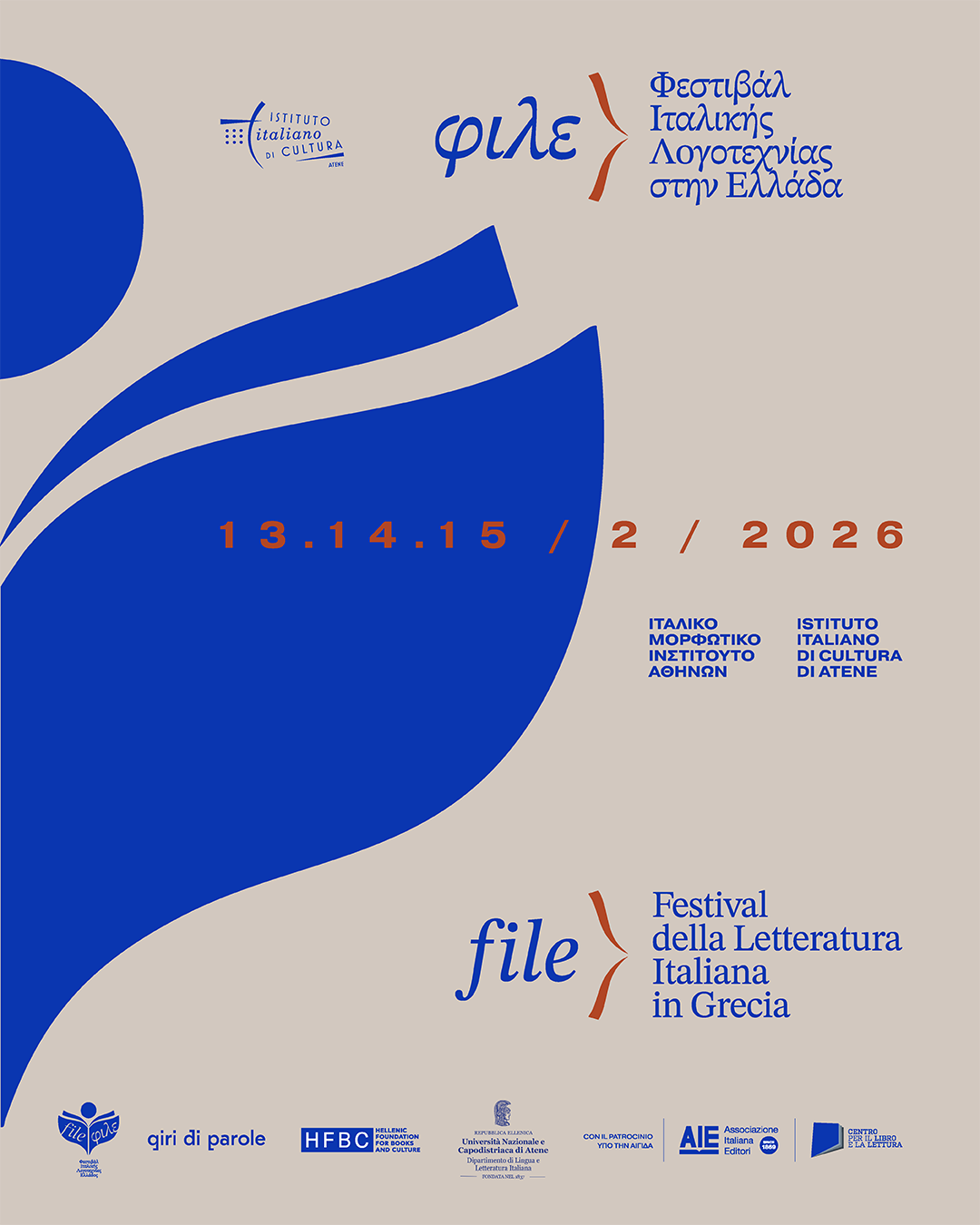 Το Ιταλικό Μορφωτικό Ινστιτούτο Αθηνών σε συνεργασία με το Ελληνικό Ίδρυμα Βιβλίου και Πολιτισμού (ΕΛΙΒΙΠ), το Τμήμα Ιταλικής Γλώσσας και Φιλολογίας του Εθνικού και Καποδιστριακού Πανεπιστημίου Αθηνών, την ένωση Giri di parole, και υπό την αιγίδα της Ένωσης Ιταλών Εκδοτών-ΑΙΕ και του ιταλικού Κέντρου για το βιβλίο και την ανάγνωση-CEPELL σας παρουσιάζει με χαρά την πρώτη διοργάνωση του.