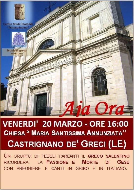 Μια ομάδα πιστών που μιλούν τα ελληνικά της Σαλέντο θα θυμηθεί τα Πάθη και τον Θάνατο του Ιησού με προσευχές και ύμνους στα γκρίκο και στα ιταλικά.