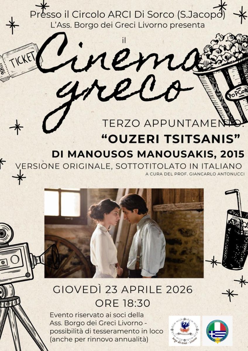 The second screening is part of the "Greek Cinema" program, which was previously agreed upon with the "Borgo dei Greci" association of Livorno, chaired by Umberto Cini. The film is Uzerì Tsitsànis (Ουζερί Τσιτσάνης), which we will see together on Thursday 23rd of April 2026, starting at 6:30 pm. The story is based on the novel by Iorgos Skambardonis, "L'ultimo rebetiko," translated into Italian.