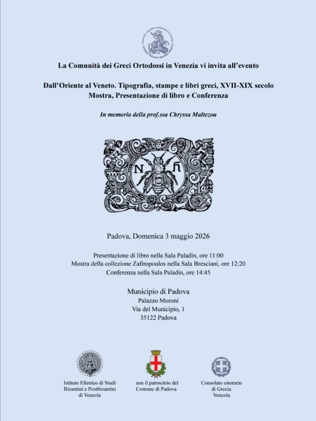 "Dall’Oriente al Veneto. Tipografia, stampe e libri greci, XVII-XIX secolo - Mostra, Presentazione di libro e Conferenza"